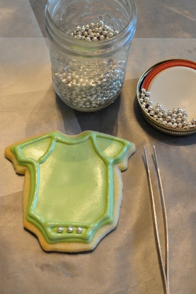 These little tweezers came as an extra set with my Serger so I cleaned and threw in with my cake and cookie decorating supplies. Very handy for applying these silver dragees as snaps. Tip* – I tried placing them with just my fingers and they never landed on the little drop of icing once 😉