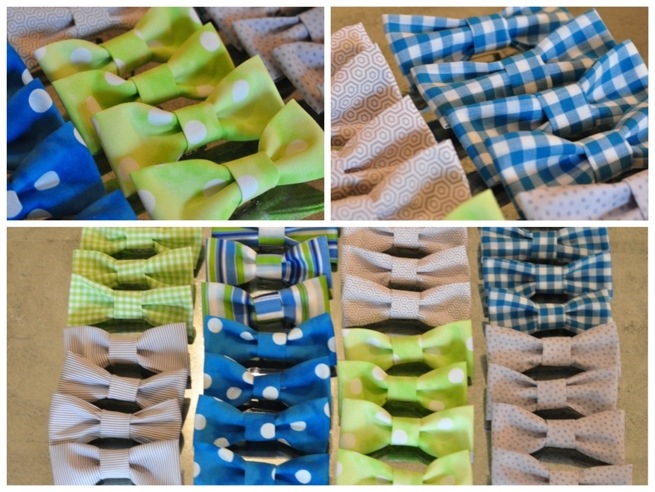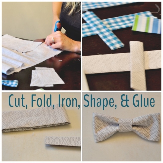 Cut the fabric in 4.5″ by 9″ rectangle for the main bow tie section. Cut a 2.5″ by 2.5″ piece of material for the bow center. Iron one edge of the bow under slightly and then fold in thirds so each edge is folded under and press slightly. Repeat process for bow tie center fabric.