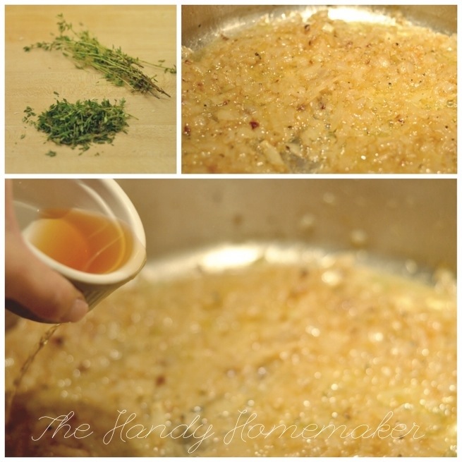 2. In a heavy pot over low heat add onions, thyme and 1/4 cup water. Let simmer over medium heat stirring and occasionally adding 1 tbsp or more of water to prevent sticking. (You can throw the fresh thyme in whole and remove the stems later or pull off the leaves and add to the soup)