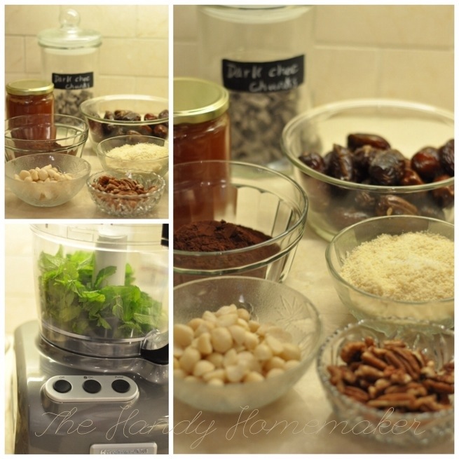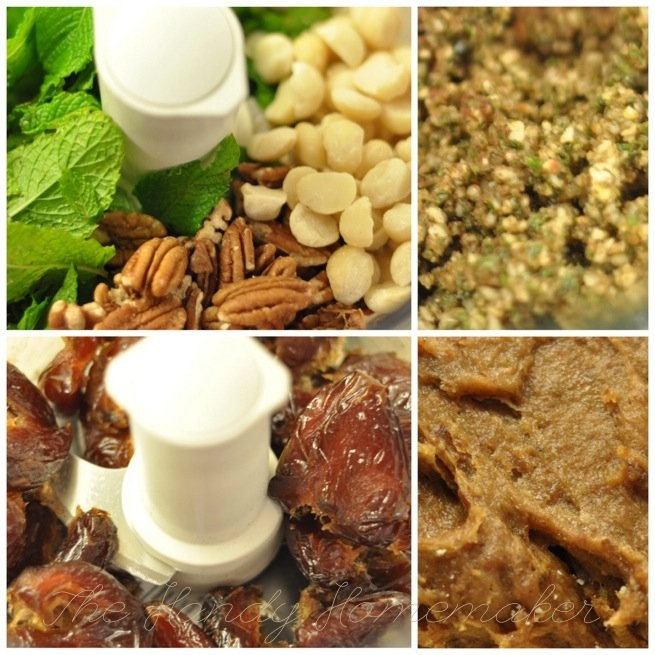 1. Add mint, macadamia nuts, and pecans to a food processor pulse until finely ground and combined, scoop into a separate bowl.