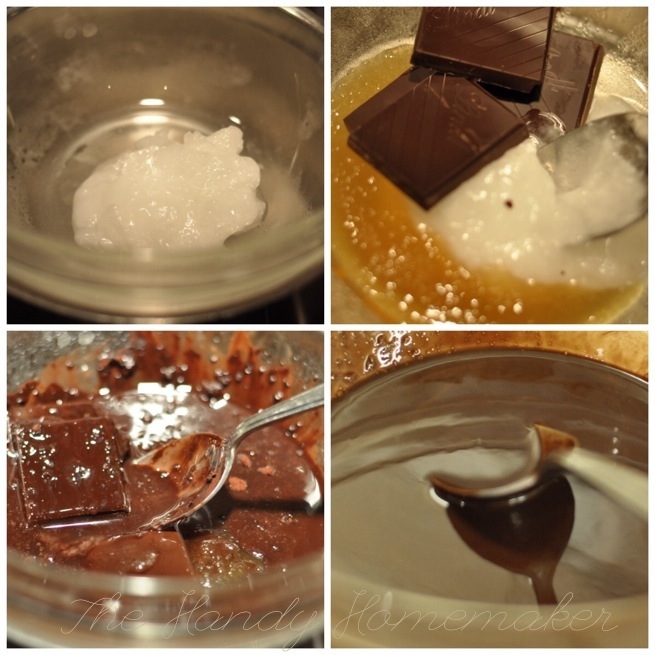 1. Add the coconut oil, honey, chocolate and cocoa to a double boiler over simmering water. (or a sauce pan with a bowl that rests on top of the pot)