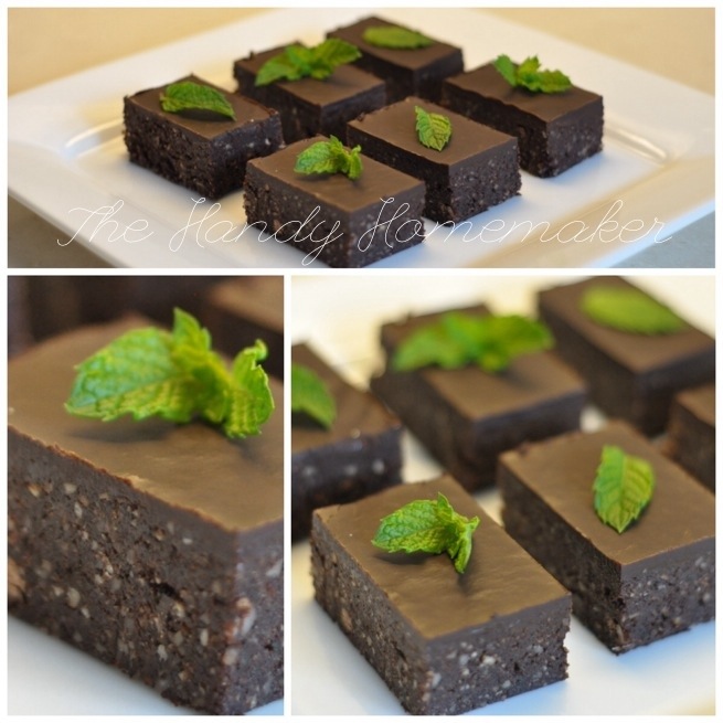 These are a no bake, gluten, & wheat, and dairy free brownie. Not everyone will like these, I know. We are not completely, wheat and gluten-free, but we are trying to eat less of it. I adapted this recipe from an old coconut macaroon recipe. Instead of using mint extract, I used fresh mint from that garden of mint that never quits. Of course you could omit mint altogether and add another flavoring. Fresh mint is great for digestion and dates are full of fibre, plus dates make this recipe sweet with only adding 350 calories for all 15 dates in the recipe. I switched out the coconut for a mixture of ground nuts. I have also made a version of this recipe minus the mint and with unsweetened coconut instead pecans and macadamia nuts rolled into balls, rolled in more coconut, chilled then drizzled the chocolate glaze over. Yummy. Experimentation is good.