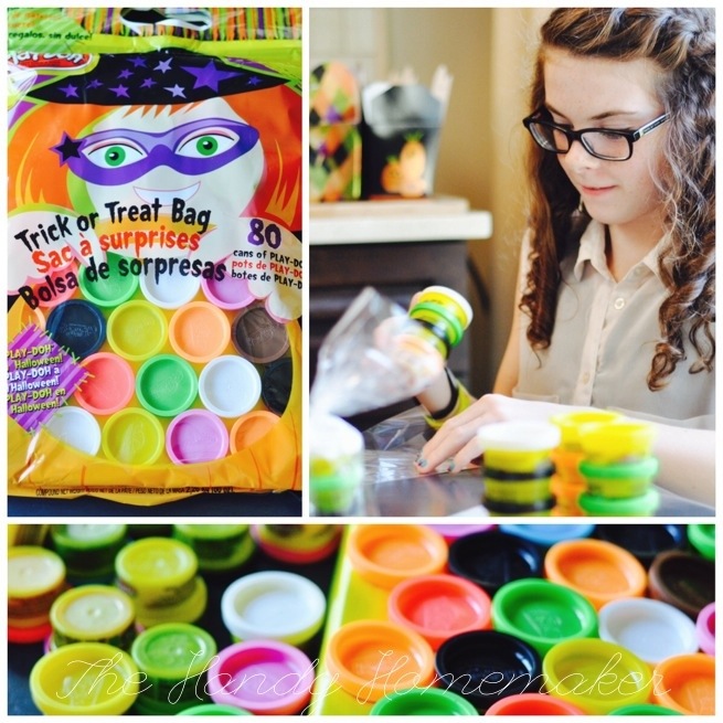 I was quite excited to find this package of 80 mini play-doh at Costco. I love seeing all those little faces at our door, especially now that my children are too old for “Trick or Treating”. I try to make special little treats for the kids we know in our neighbourhood. When I saw these I thought they would be a perfect addition to my special treat boxes. I decided to use only the green, white, yellow, black, and orange colors. The rest I saved for those times little kiddo’s are visiting and are looking for something to do. My children loved to package up the treat bags every year, and this year I had a young neighbour friend, Abby come visit and package up part of the treat boxes for me.