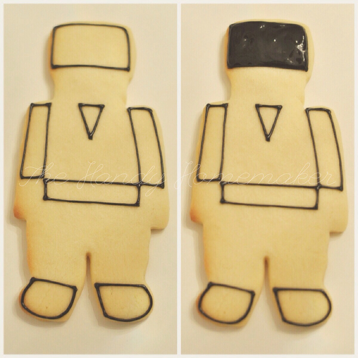 - Use the black piping icing start to outline the black areas: feet, arms, neck triangle, hat and belt area. (for the belt area leave a space for the green buckle)