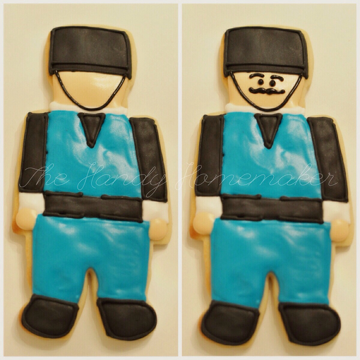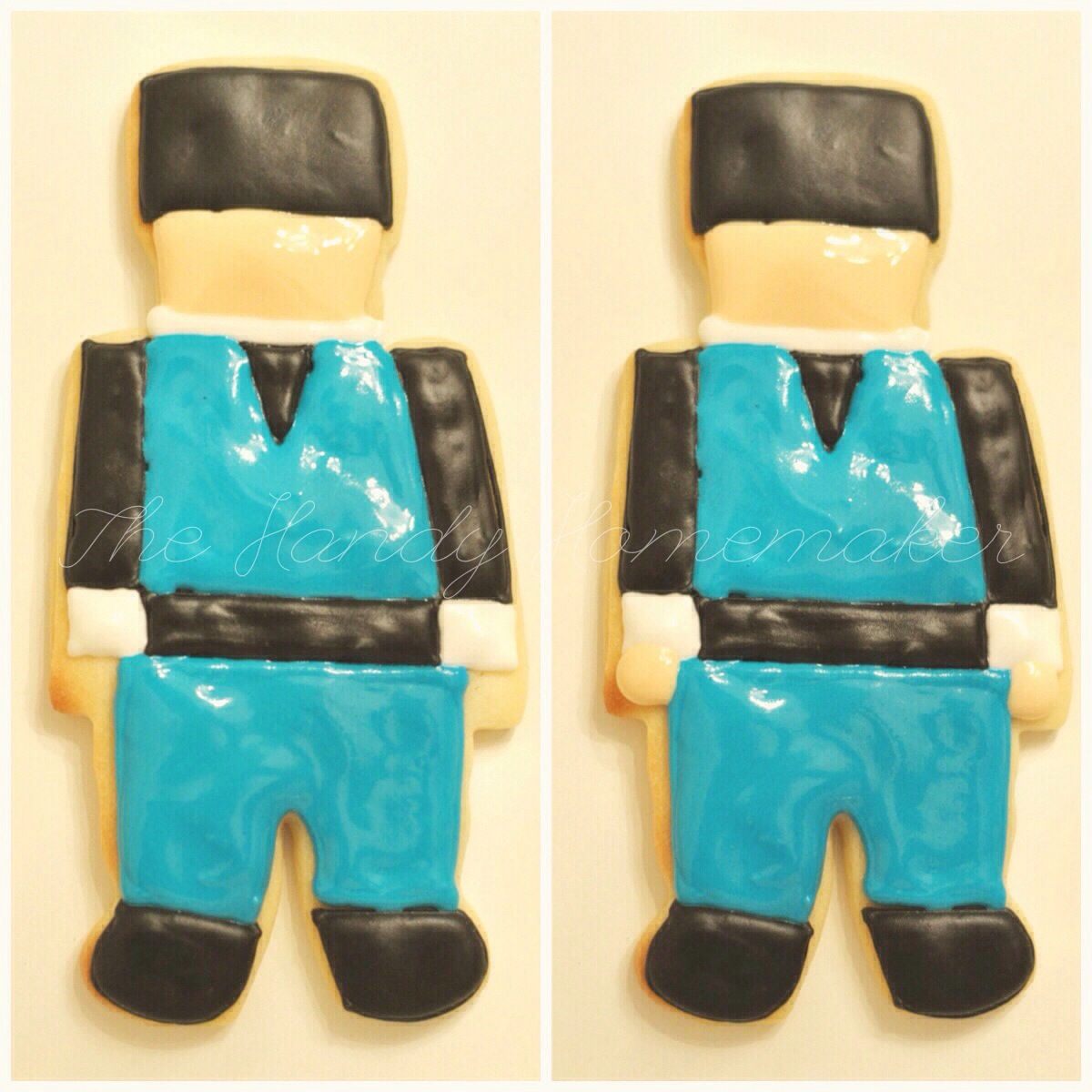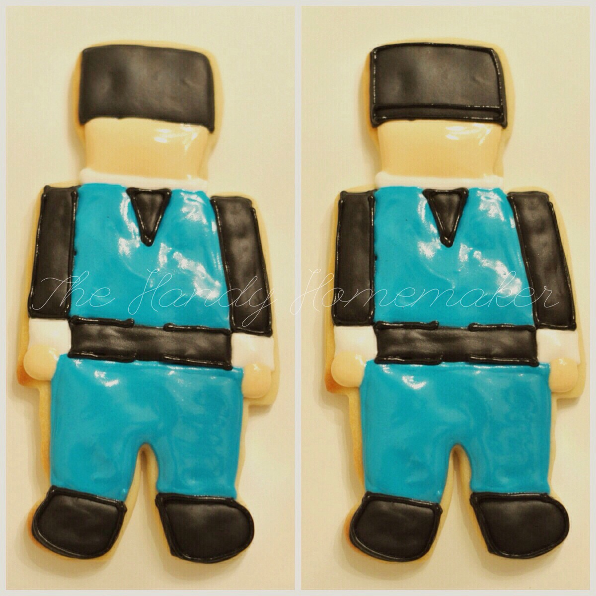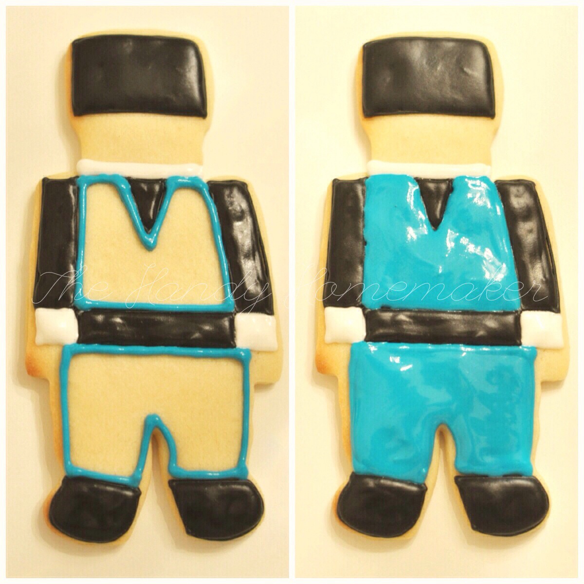 - Using blue piping icing pipe the outline of the chest and pants.