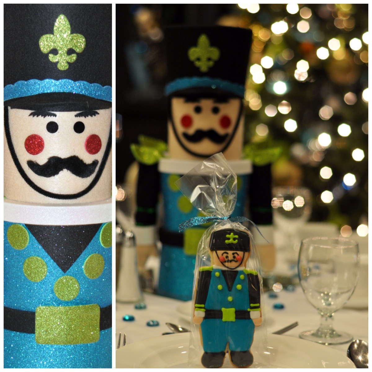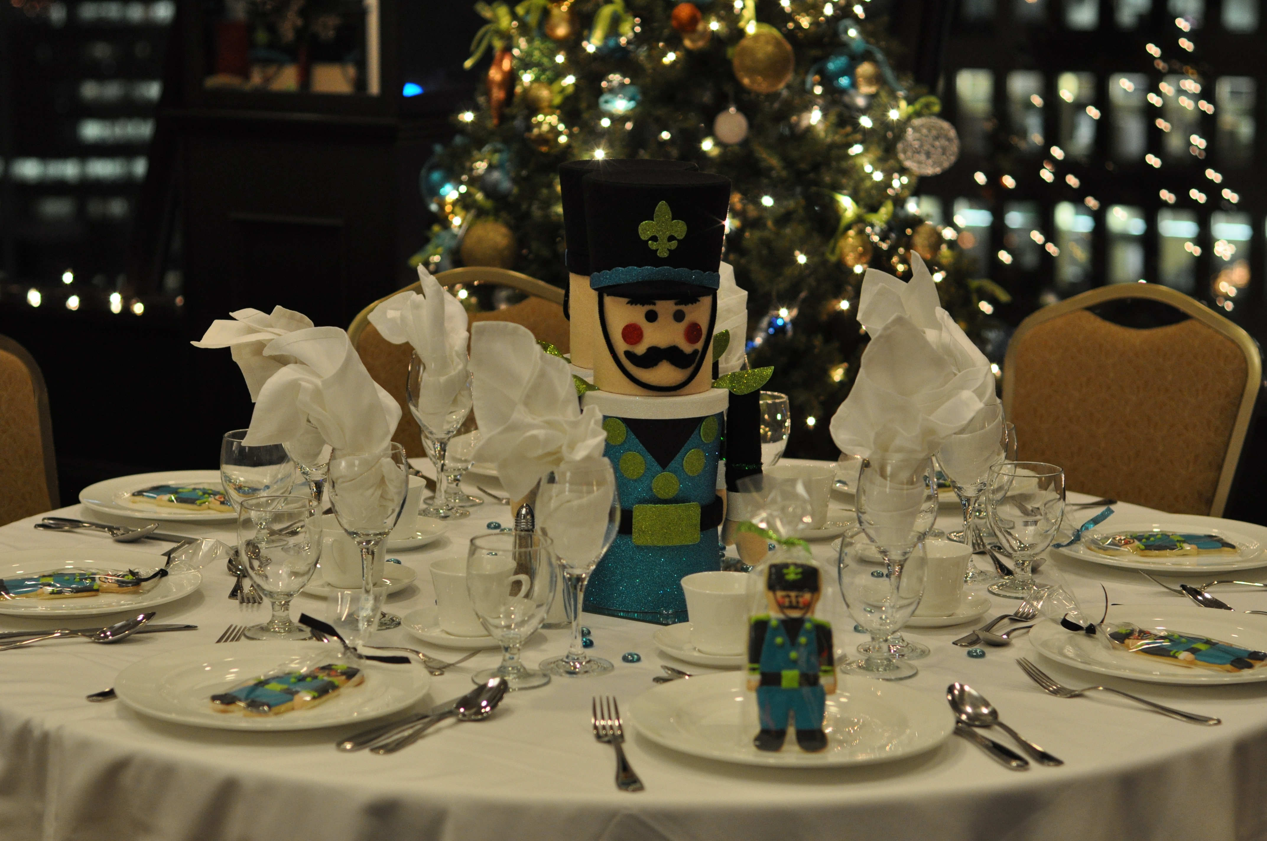 Here is a picture of the finished table setting minus the tea lights. I was very happy with how these sweet Nutcracker soldiers glittered in the candlelight. We are so lucky to host our event at the Delta in their beautiful room that has amazing views of the water and the city of Halifax.