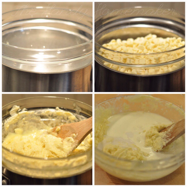 • Some white chocolate doesn’t melt as easy as others.  I used a bag of white chocolate chips as it’s something easily available at most grocery stores.  I usually use Callebaut chocolate available at the Bulk Barn.