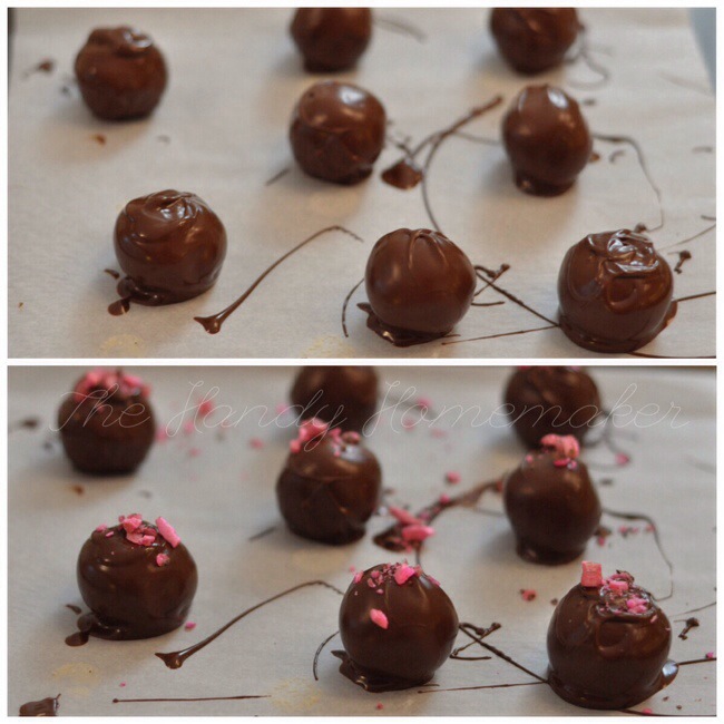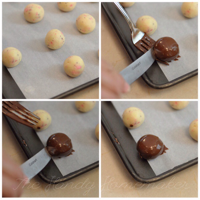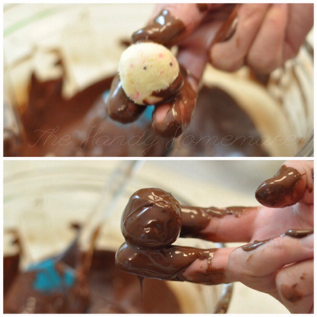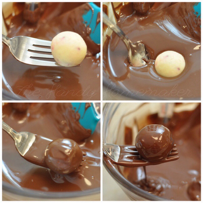 • Using a fork dip the truffle in the chocolate, lift out tamp the fork on the side of the bowl to allow the extra chocolate to drip off