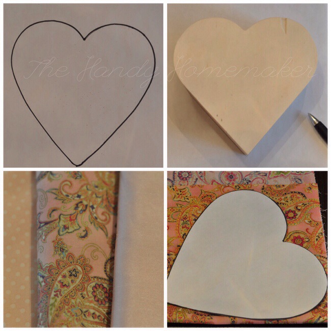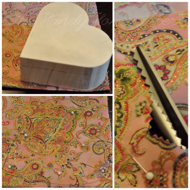 1. Using a pattern of your choosing, this can be a square if you like, trace the pattern onto a double layer of fabric that is folded right sides facing out. I’m using the gift box that I found these great wooden boxes at the dollar store ($2) as my pattern. Sturdier boxes could be purchases at your local craft store. I will post a picture a picture of the finished product.