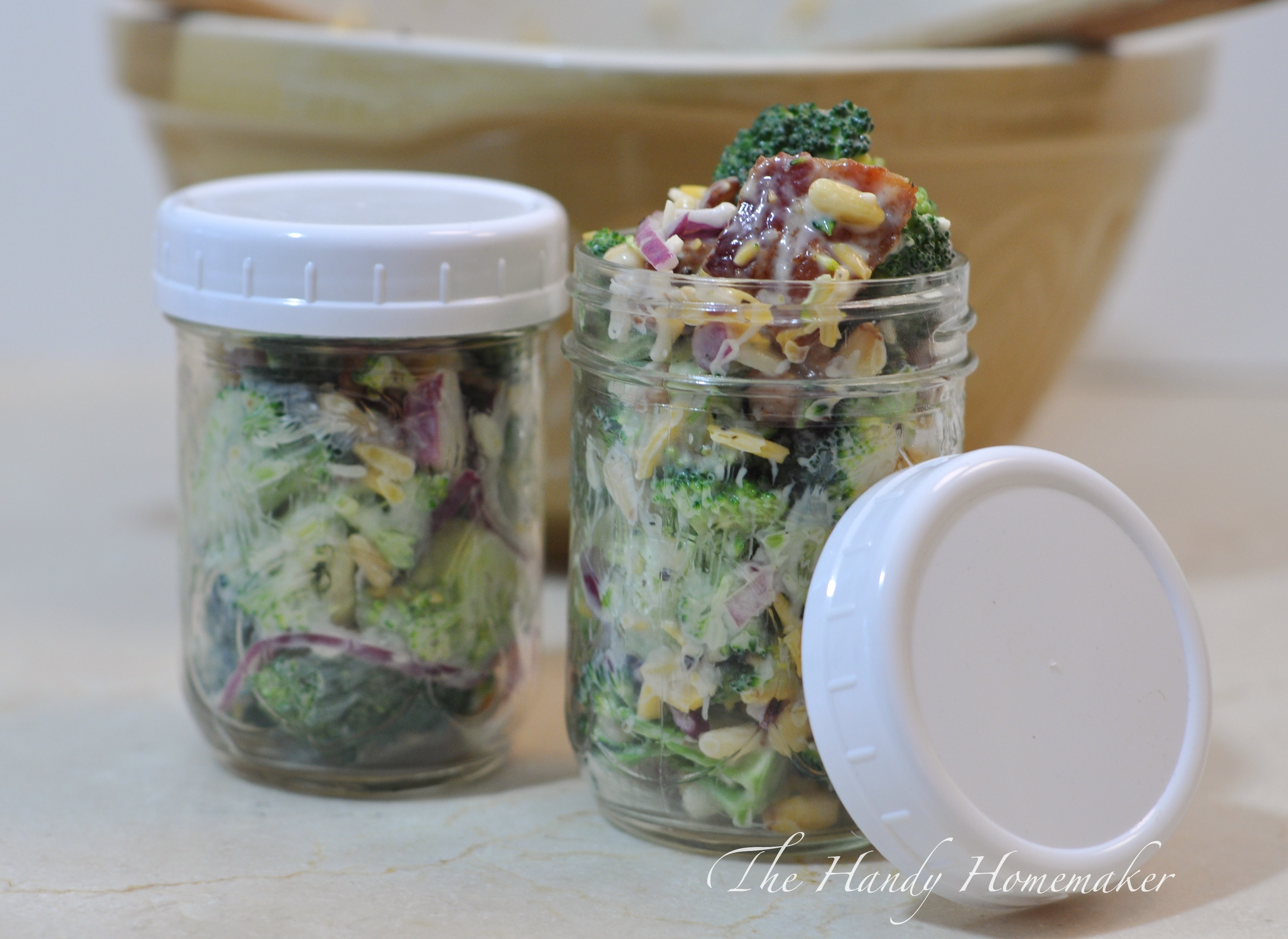 I love storing left over salad in these small mason jars with plastic lids. They are the perfect size to add to a lunch, as this salad is still great the next day.
