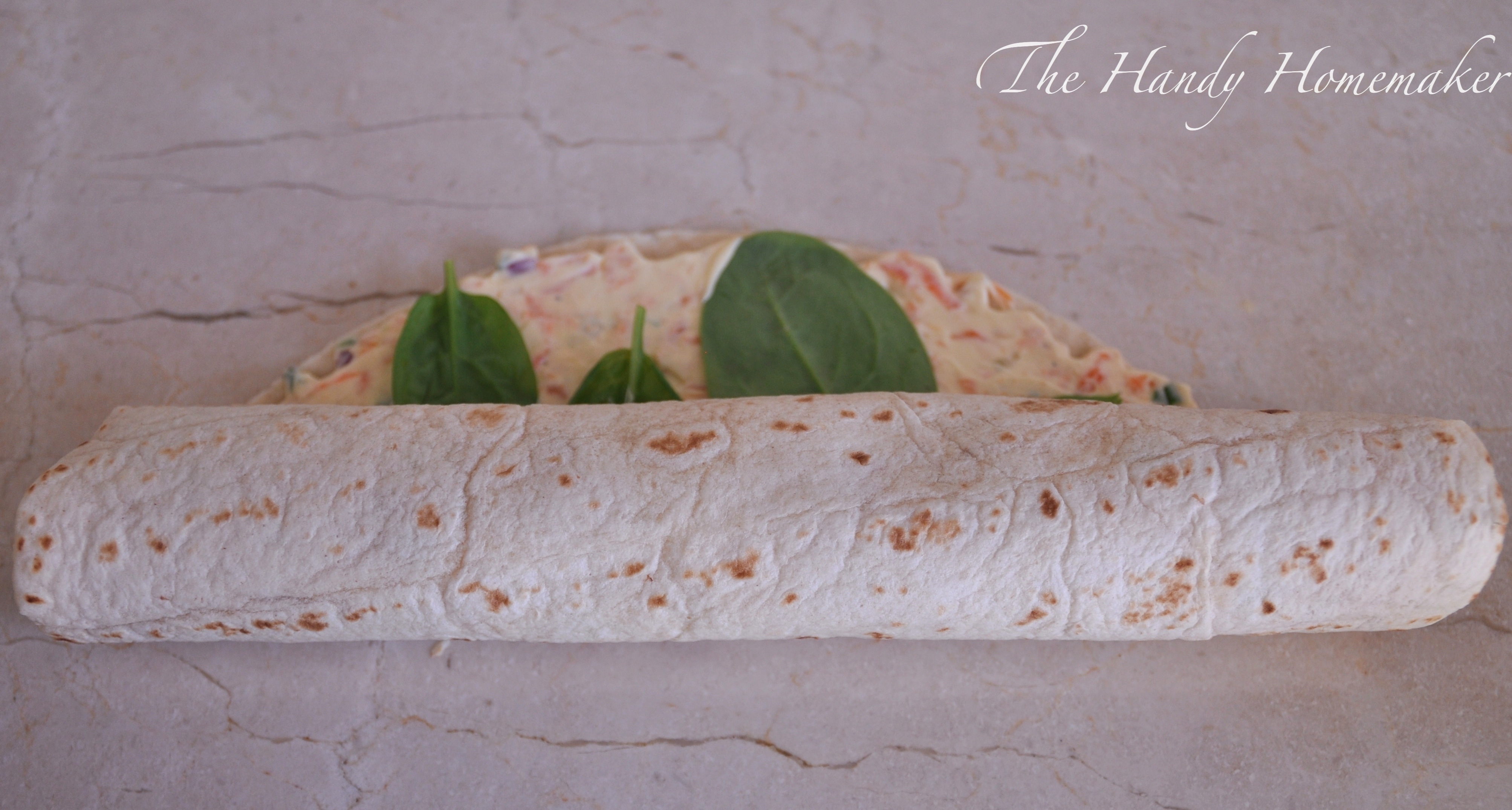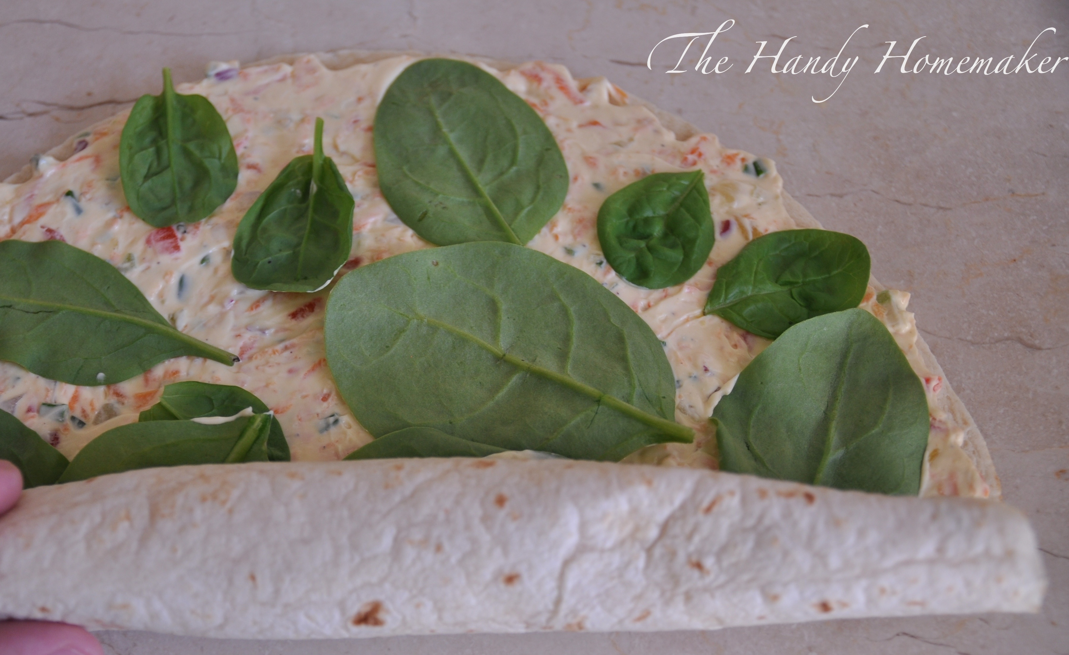 3. Place a layer of baby spinach over the cream cheese mixture leaving some of the cream cheese mixture visible as it is needed to make the roll stay together as you roll it. This is the basic wrap and they are delicious just like this. However you may also take it up a notch by adding julienned vegetables like cucumber, sprouts, green pepper, lettuce and apple. Place a strip along the center of the roll as per images below. Slice and serve! The flavour combinations are endless.