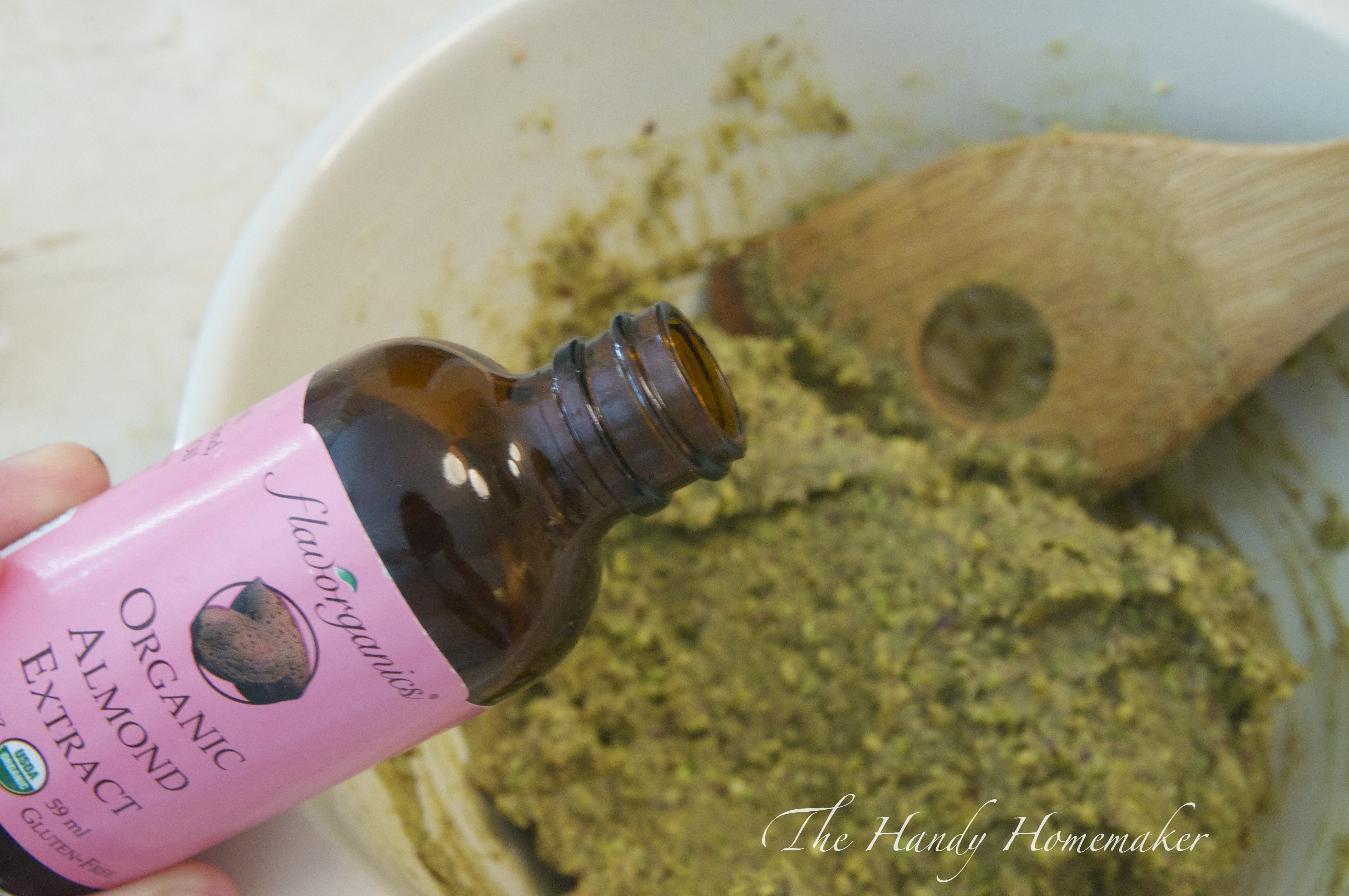 1/2 cup pistachio paste– 1/2 cup peanut butter,1 cup pistachios– 1 cup peanuts (finely mince/chop will measure a little over 1/2 cup)- omit the almond extract.