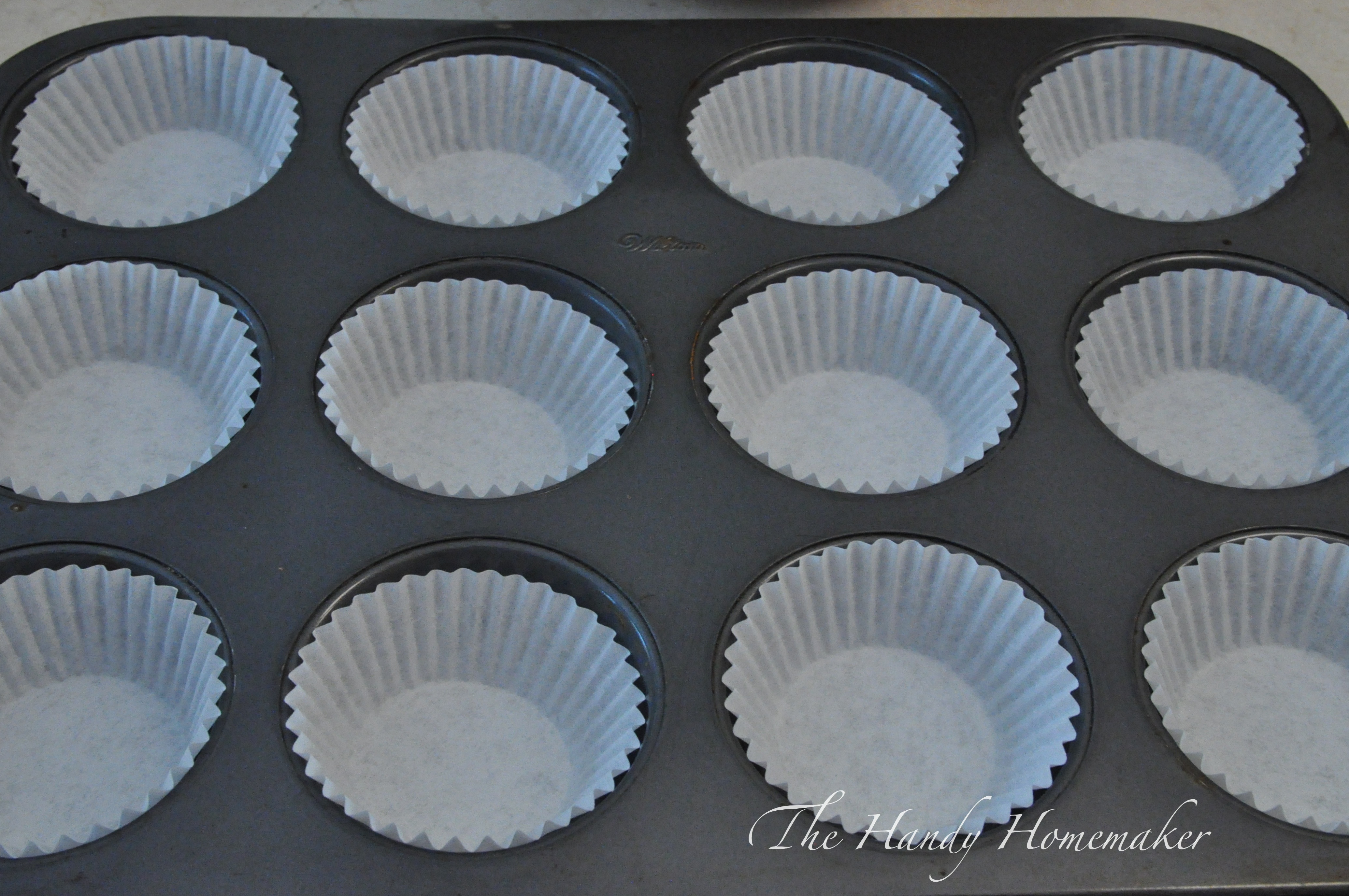 While chocolate is melting add baking cup papers or candy papers to a muffin tin