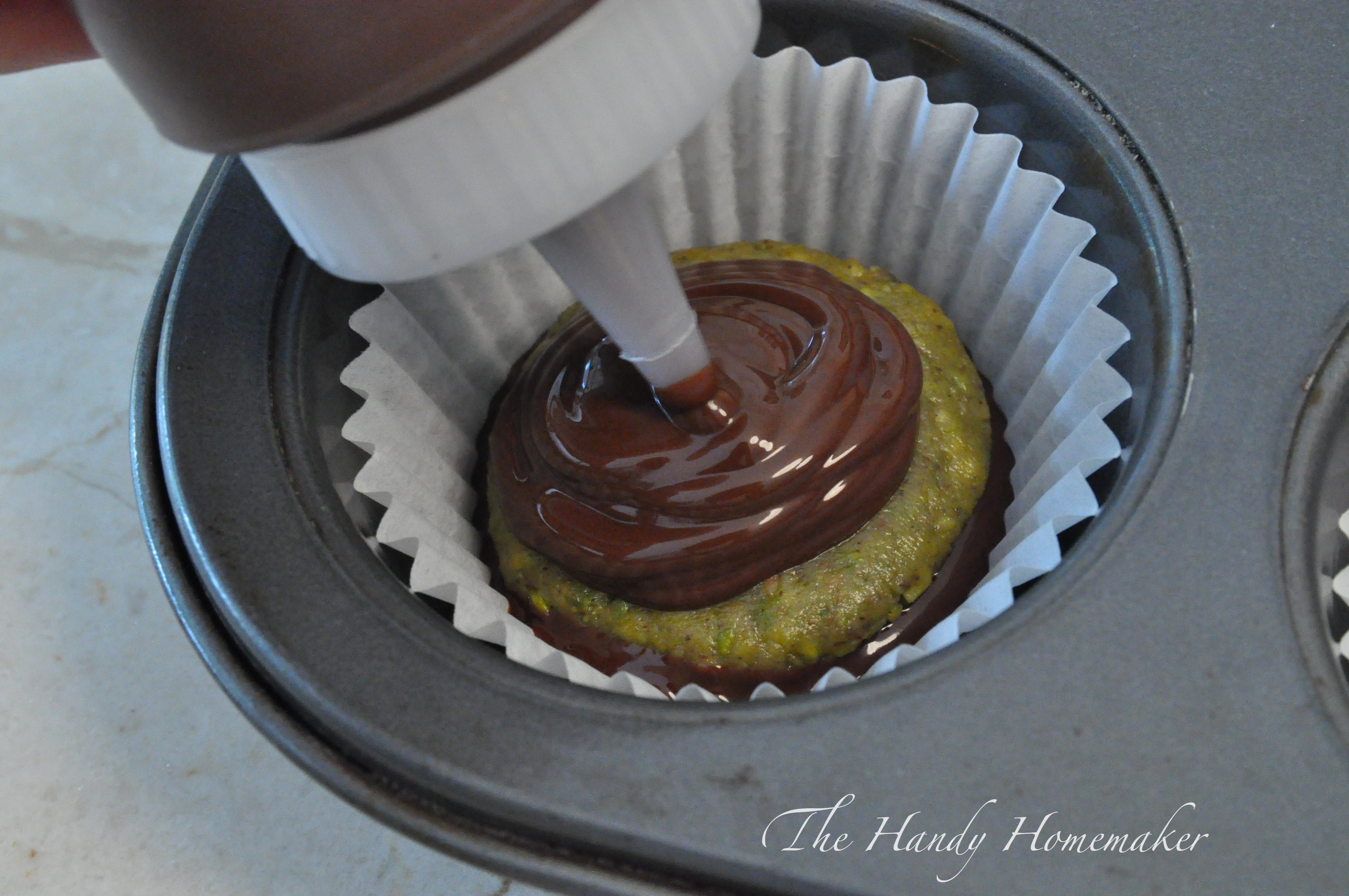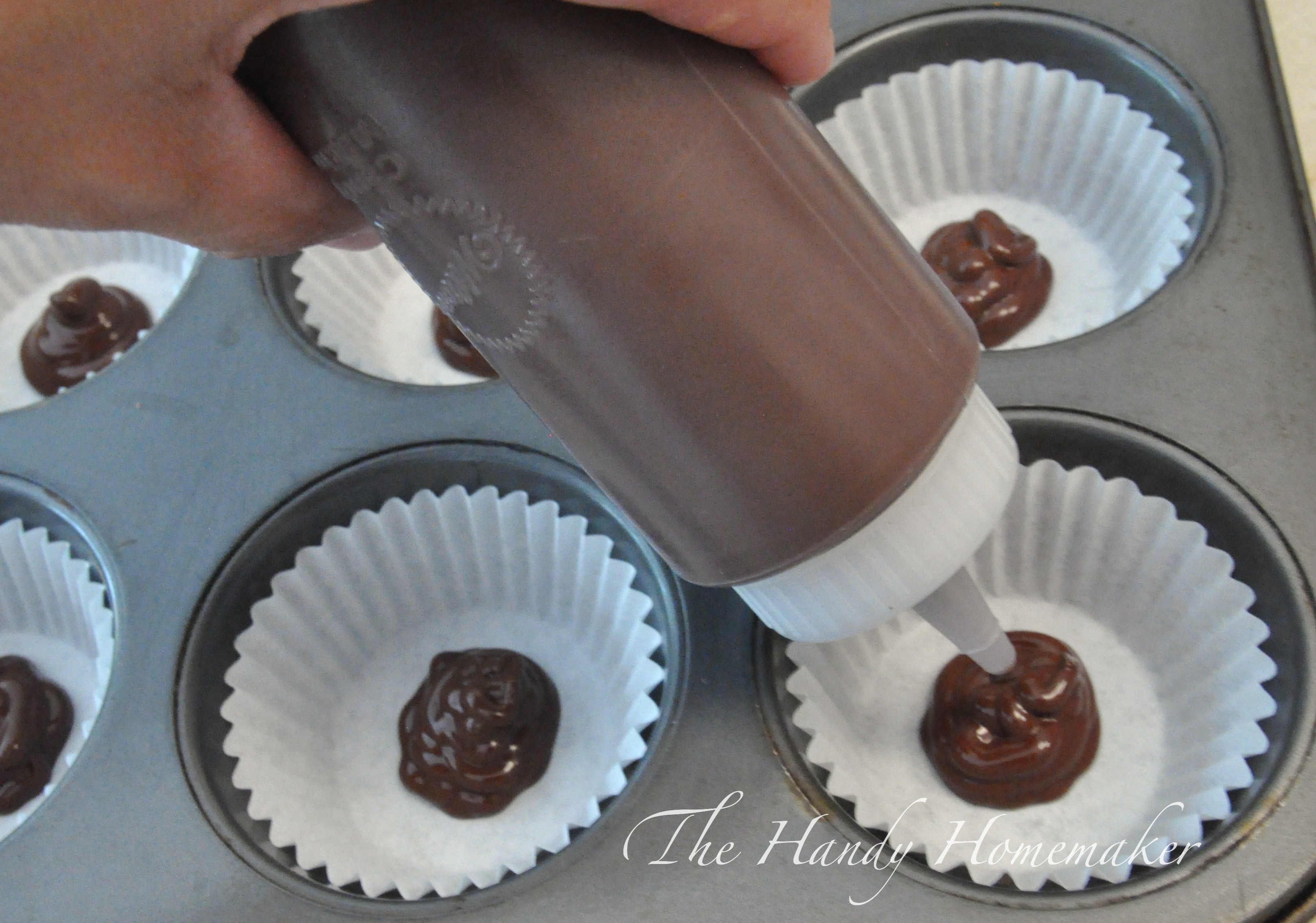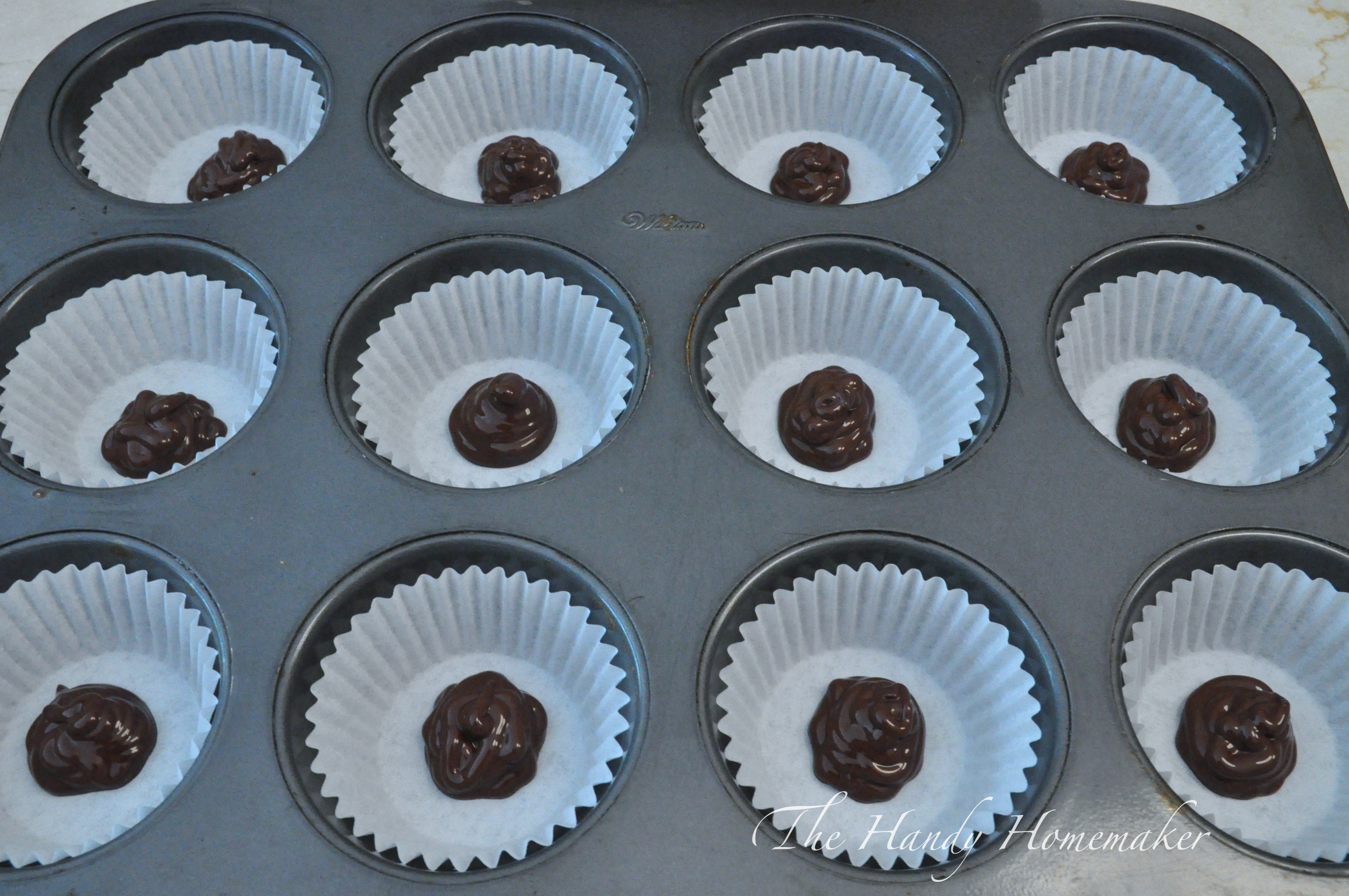 Add about 2 teaspoons of chocolate to the bottom of each baking cup