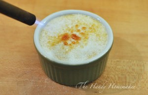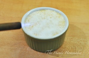 Serve in a small ramekins, add the crumb mix to the bottom and tamp.  Add the cheesecake mixture and refrigerate for a minimum of 1-2 hours.  Just before serving, top with 1 -1/2 – 2 tsp of granulated sugar.  Using a brulee torch, quickly caramelize the  sugar until golden.  Let cool slightly, serve as is or top with whipped cream and serve immediately.